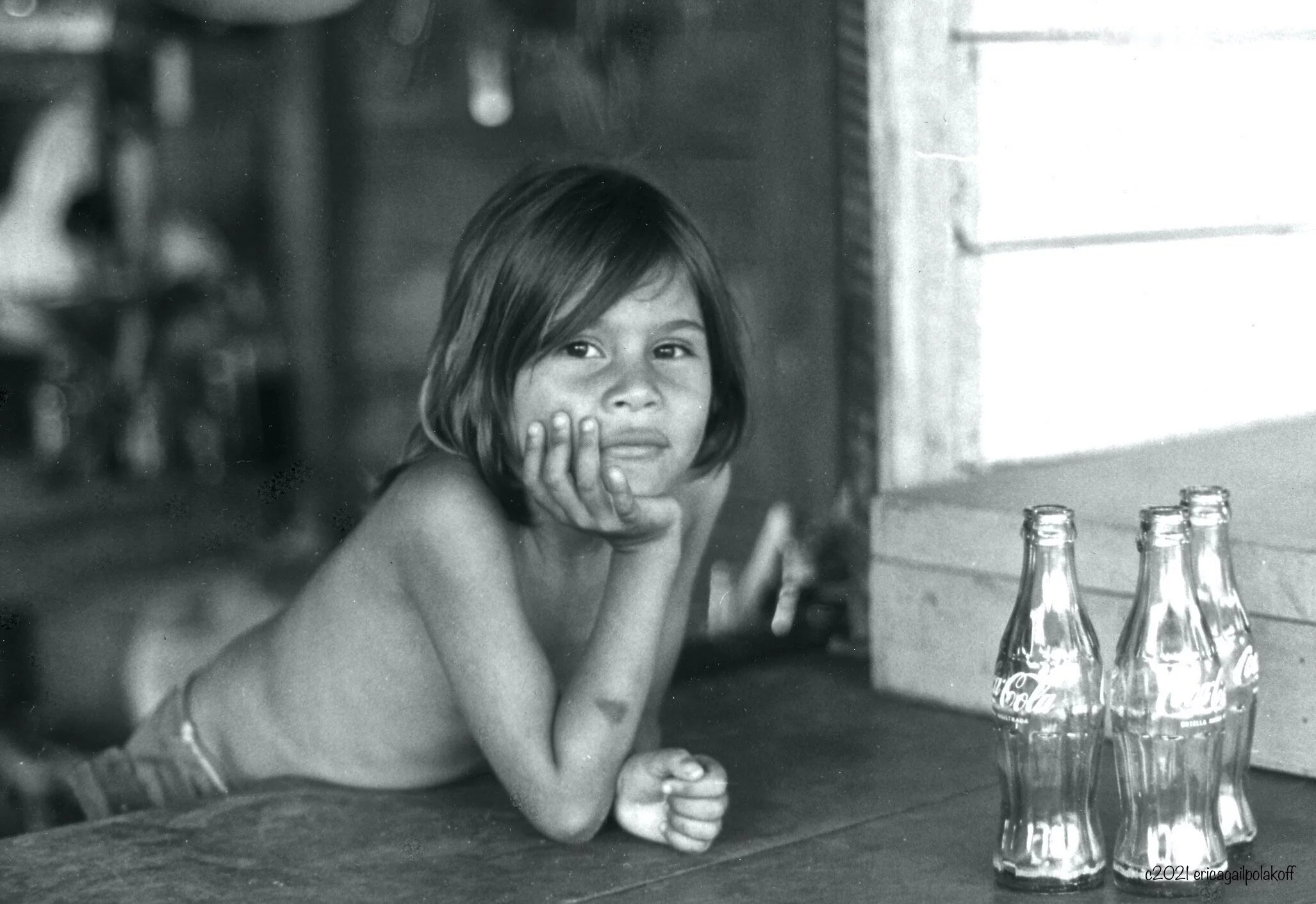 I had always been drawn to b&w photography, and I was (and forever will be) in awe of how Ansel Adams could make mountains appear as though they were lit from the inside out. However, I hadn’t yet found myself in a place where the landscapes demanded to be seen in black-and-white. In Tocoa, my focus was people, particularly the kids we worked with in the schools (Portfolio 2). This is AlmaOndina, one of eight kids who lived next door with their mom. From the window ledge of the front room of their home, they sold mostly warm Coca Colas. The year was 1978.